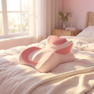 图中是一个粉色毛绒爱心抱枕(尺寸为33x25cm),请生成一张分开放两个图中的抱枕在卧室的床上,正视,正放