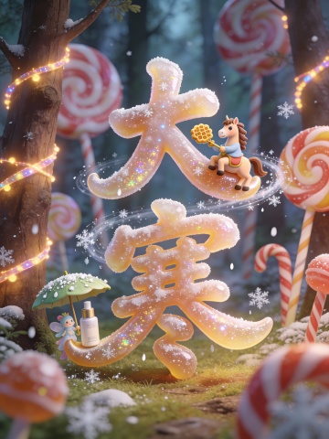 梦幻糖果森林中,软3D风大字“大寒”闪耀着甜蜜粒子光效,拟人小马与精灵相伴,卡通粘土质感搭配浮雕光影,营造出温暖可爱的冬日节气氛围。