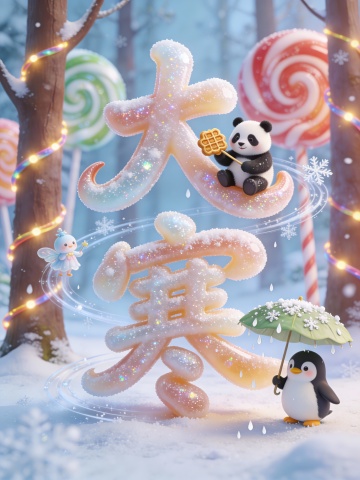 梦幻感十足的软3D风设计,大字“大寒”以玻璃质感呈现,搭配熊猫、企鹅等卡通角色,融入糖果森林与粒子光效,营造出超现实主义的冬日童话氛围。