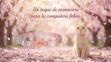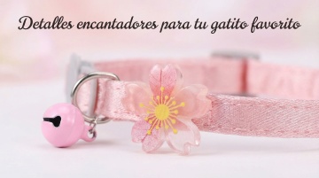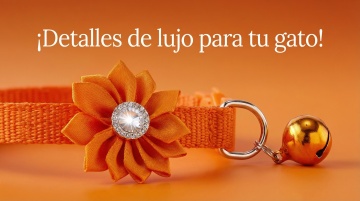以图中的猫咪项圈为元素,设计6张跟猫咪项圈有关的图,比例 「16:9」,语言是西班牙语