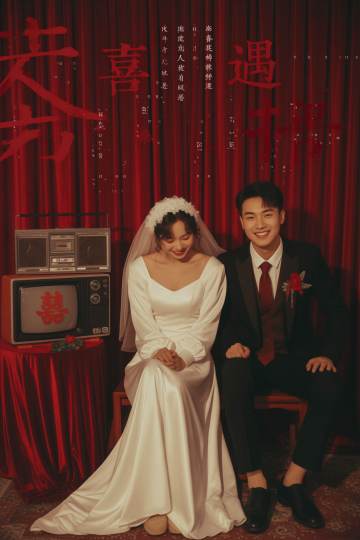 我上传了两张图片,请你在第一张图片的基础上跟我的修改输出 1. 新郎新娘人物模型替换成 第二张图的人物模型,切记改动花环拱门,这个是必须保留的