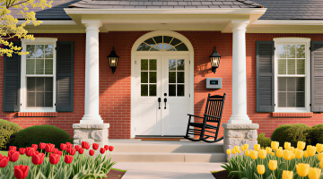 写实风格庭院景观,晴朗白天,明亮的蓝色天空点缀着蓬松的白色云朵,阳光充足,光线柔和,绿色草坪修剪整齐,翠绿鲜亮,位于画面前景,占较大比例。两层白色坡屋顶别墅,灰黑色屋顶,白色墙面带绿色百叶窗,门前有石阶,两侧摆放着种植花卉的花盆,周围环绕着修剪整齐的绿色灌木丛和盛开的红色、白色花朵,右侧有一棵红叶树,整体色彩和谐,氛围宁静舒适,庭院开阔,布局美观,充满生机。