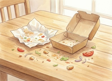 桌子上摆着很多美食,还有很多吃了一半的食物,还有空了的汉堡包装和杯糕的包装