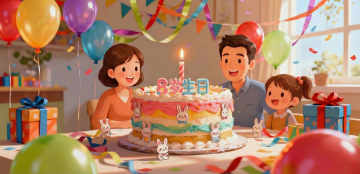 小女孩站在客厅中间,双手举着插了蜡烛的草莓蛋糕,另一只手攥着画满向日葵的卡片,踮着脚仰头喊 “Surprise”,声音脆生生的,周围气球轻轻晃着。