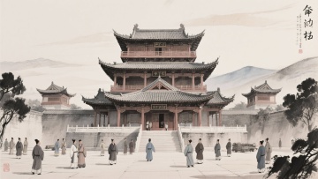 中式古典场景,3D重拟物风呈现古代城建实景,水墨与岩彩元素融合,人物服饰考究,展现先民筑城劳作的生动画面。