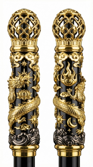 鎏金浮雕龙纹杖,黑底金饰,融合中式古典与欧洲宫廷艺术,重拟物设计彰显奢华国潮风。