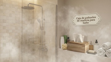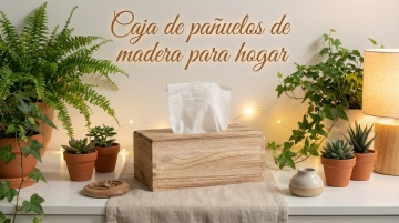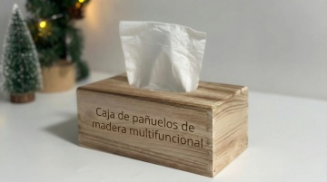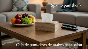 以图中的木制纸巾盒为元素,适用于卫生间客厅茶几浴室办公室餐巾纸,设计6张跟木制纸巾盒有关的图,比例 「16:9」,语言是西班牙语