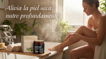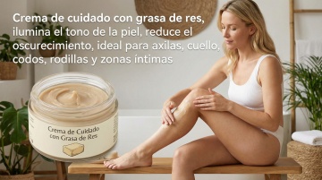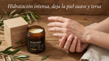 以图中的牛脂护肤膏为元素,欧美女人使用牛脂护肤膏,深层保湿滋润改善干燥补水滋养柔嫩润肤,设计6张跟牛脂护肤膏有关的图,比例 「16:9」,语言是西班牙语