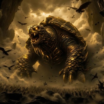 插画风国潮设计,鎏金龙纹盾牌,火焰环绕,尽显神圣与威严。