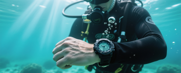 702x263 wide banner, photorealistic underwater close-up of scuba regulator second stage in use, crisp bubbles rising, diver face partially visible but not dominant, teal-blue water, soft sun rays from surface, high-detail hoses and fittings, documentary underwater photography, natural color, slight water particles, shallow depth of field, no text, no logo