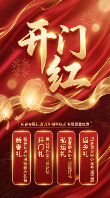 国潮风融合鎏金浮雕字,红金配色彰显喜庆奢华,大字风突出“开门红”主题,结合灯笼与祥云元素,营造浓厚中式新春氛围。