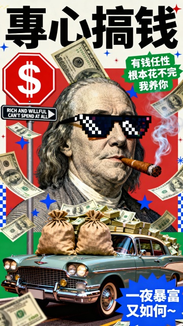 鎏金3D大字“超有钱”层层叠叠,金属质感闪耀,金币环绕,奢华满溢,尽显财富狂欢氛围。