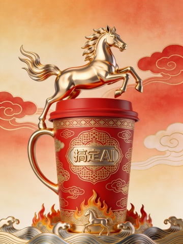 国潮风与重拟物结合,鎏金骏马跃立红杯之上,浮雕纹饰尽显中式奢华,火焰浪涛烘托喜庆氛围,金属质感彰显高端视觉。