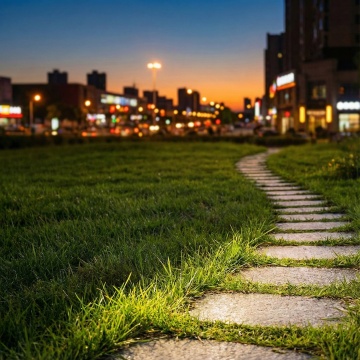 超写实风格商业步行街黄昏场景,暖金色夕阳低角度照射,天空呈现渐变的蓝紫色与粉橙色云彩,现代风格多层商铺建筑,玻璃幕墙与木质、金属材质结合,底层商铺灯火通明,行人悠闲漫步,远处城市高楼剪影,地面光洁反射光影,整体氛围繁华、时尚、充满活力,具有高端商业地产的视觉质感与吸引力,构图采用透视线引导,视觉焦点集中在步行街中央区域,光影对比鲜明,细节丰富,符合商业宣传所需的高品质、吸引人的场景呈现。