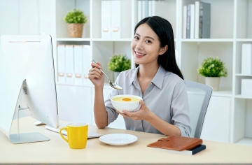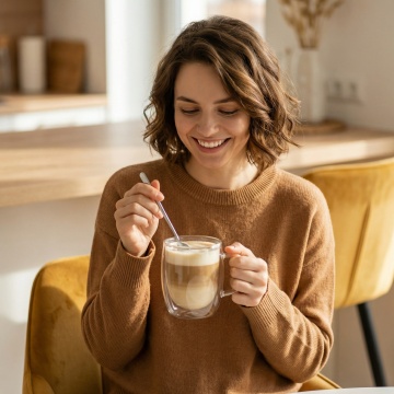 明亮的现代办公室环境,柔和的自然光透过大面积玻璃窗洒入室内,温暖的木质办公桌,桌上放着笔记本电脑、打开的笔记本、蓝色马克杯和一支铅笔,穿着米色开衫与白色衬衫的女性正在专注地使用笔记本电脑,背景有白色书写板、木质书架和简约办公家具,整体风格简约、专业、温馨,具有清晰的空间层次感和舒适的工作氛围,高清晰度,写实摄影风格,柔和光线,自然色彩。