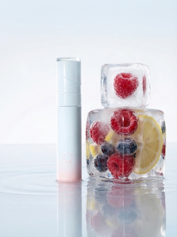 清透玻璃瓶身融合金属质感,置于雪域冰晶间,3D渲染呈现虚拟自然的清爽科技美学,未来感十足。