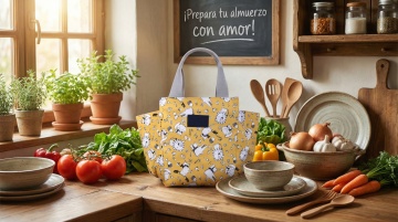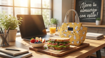 以图中的保温午餐包为元素,设计6张跟保温午餐包有关的图,比例 「16:9」,语言是西班牙语