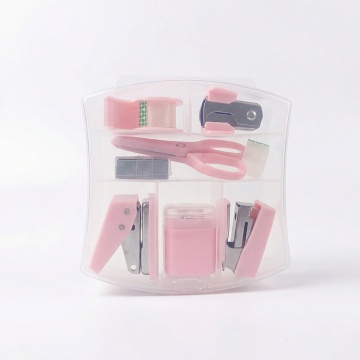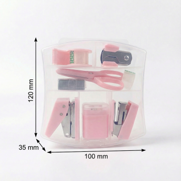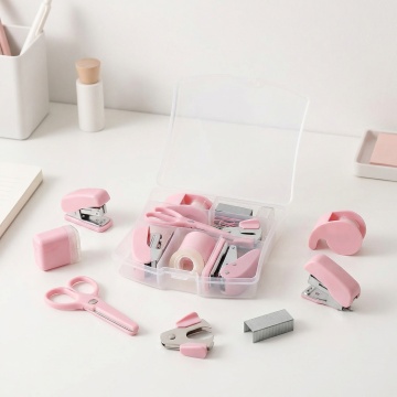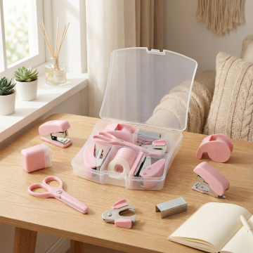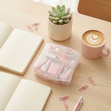 一张纯色背景的设计图,展示了6个完全不同材质的同元素、同造型的系列夹子素材集合,这些夹子规整排布。夹子的造型保持一致,为经典的回形针式设计,带有弯曲的顶部和夹纸的部分。6个夹子分别采用了以下材质:1. 光滑的塑料材质,呈现出柔和的淡粉色,带有细腻的光泽感;2. 磨砂金属材质,呈现出银灰色,表面有细微的磨砂纹理;3. 透明水晶材质,清澈透明,带有淡淡的蓝色调,边缘有折射光效;4. 木质材质,呈现出温暖的浅棕色,木纹清晰可见;5. 皮革材质,呈现出深棕色,表面有皮革特有的纹理和光泽;6. 陶瓷材质,呈现出纯白色,表面光滑细腻,带有轻微的哑光效果。每个夹子都夹着一张淡粉色的纸片,纸片的边角有轻微的弧度,整体设计简洁、现代,具有很强的视觉统一性和系列感。