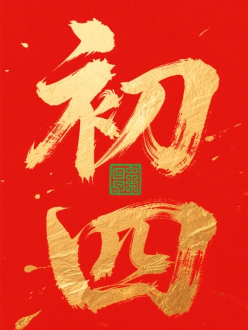 主体是巨型金色书法 “初一”,笔触苍劲有飞白质感,字间嵌入绿色传统回纹印章图案。红色背景。