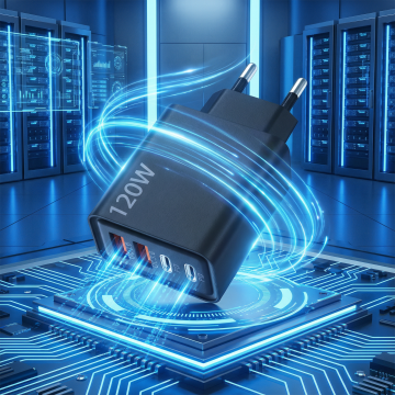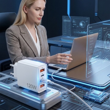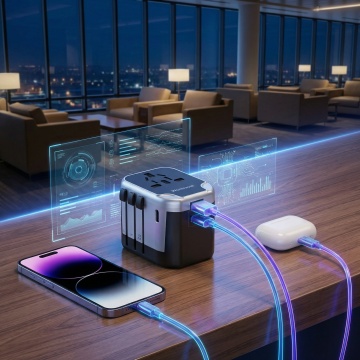 赛博朋克风格的智能手机充电场景,霓虹蓝与紫色渐变光效笼罩,手机屏幕显示动态赛博数据流图案,充电器和数据线呈现金属质感与霓虹灯带装饰,白色桌面转化为带有电路纹理的黑色高科技平台,背景墙变为布满全息投影广告和管线的未来都市夜景,整体光影对比强烈,充满未来科技感与机械美学,高细节,8K渲染,电影级构图