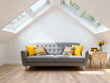 采光与视野:多扇白色大窗引入充足自然光,窗外能看到太阳,蓝天,英式乡村风格的建筑,增添了通透感;