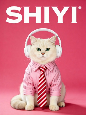 拟人风猫咪身着条纹衬衫与红白领带,佩戴耳机,梦幻紫瞳与毛发生长细节展现可爱感,杂志风封面设计融合时尚感与动漫元素。