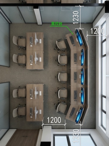 3D渲染风格的现代办公空间,以明亮的自然光为主,搭配天花板上悬挂的矩形LED平板灯提供均匀照明,主色调为白色、浅灰色与深灰色的专业商务配色,辅以木质办公桌的温暖色调和绿植的点缀色彩。空间采用开放式布局,大型落地窗引入室外城市高楼景观与秋日树木,光线透过窗户在地面投射出清晰的窗格阴影,营造出通透、开阔、宁静而高效的氛围。画面中包含多张现代简约风格的办公桌,桌面整洁,配备黑色液晶显示器、白色文件柜、金属框架的黑色办公椅,后方有整齐排列着书籍的书架,以及窗台和桌面上摆放的绿色植物。整体光影层次分明,高光与阴影过渡自然,材质表现细腻(如玻璃的通透感、金属的轻微反光、办公椅网布的质感),构图采用纵深视角,展现办公室的宽敞与秩序感。