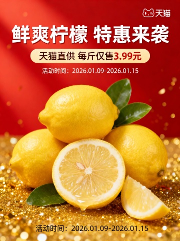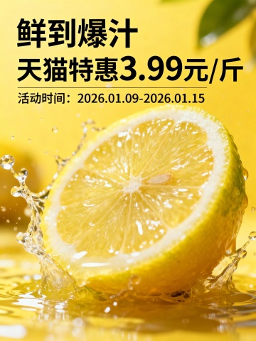 特写镜头,一颗饱满的黄色柠檬悬挂在翠绿的枝条上,表皮布满细密的白色油点与自然凸起的纹理,几片深绿色的柠檬叶卷曲着环绕四周,晶莹的露珠凝结在叶片边缘与柠檬表皮的沟壑处,折射出七彩的光斑,背景是模糊的橄榄绿枝叶形成浅景深,清晨斜射的金色阳光穿透薄雾,在柠檬表面形成明暗交错的光影,空气中弥漫着湿润的柑橘清香,整体色调是明亮的鹅黄与生机盎然的翠绿交织,散发着清新酸甜的自然气息。