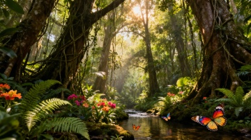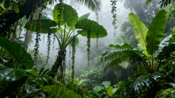 超写实风格的热带雨林场景,画面中央是覆盖着厚厚苔藓的绿色地面,呈现出自然起伏的柔和曲线,周围环绕着茂密多样的热带植物,包括宽大的龟背竹叶、细长的蕨类植物、舒展的棕榈叶以及各种形态的绿植,植物叶片纹理清晰可见,展现出极高的细节质感。整体色调以深浅不一的绿色为主,营造出浓郁的自然生机感。光线从画面上方斜射下来,形成明显的光束效果,阳光穿透茂密的枝叶,在植物和地面上投下斑驳的光影,增强了画面的层次感和空间深度。光线强度适中,既保留了阴影的细节,又让高光区域显得明亮而不刺眼,整体氛围宁静而充满活力,仿佛清晨时分的热带雨林,空气清新湿润,充满自然的气息。