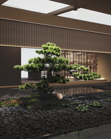 画面中央为圆形白色大理石展台,台面光滑有自然纹理,展台后方是新中式风格的浅米色磨砂质感墙面,墙面左侧有几缕柔和的斜射阳光形成光影层次。展台右侧摆放着一块形态自然的浅灰色岩石,岩石旁有一株枝干苍劲的青松,松针翠绿茂密,整体画面色调以米色、浅灰、墨绿为主,营造出宁静雅致的新中式氛围,光线柔和,阴影过渡自然,空间感通透,具有简约禅意的设计感。