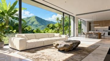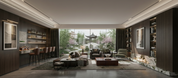 2D动漫风,一个融合中式元素的现代别墅客厅。挑高的空间,一面是巨大的落地窗,窗外是静谧的枯山水庭院。室内有明式圈椅的现代简化版、一张海南黄花梨大板茶台。石材墙面和深色木格栅形成对比。氛围禅意、留白、有秩序感。