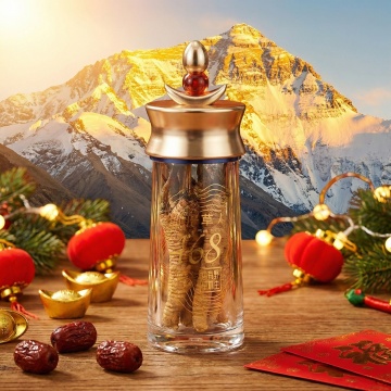 将这个圆形的产品,保持高度风格和氛围物品的一致,生成俯视角度效果,并放置在桌面上的近景特写,背景偏暖色,新年的氛围感,