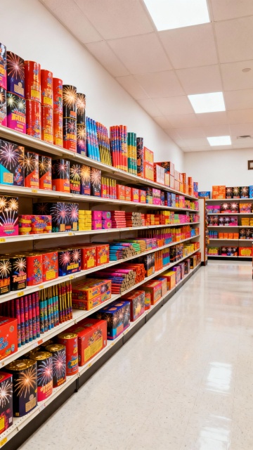 画面: 前后对比镜头。前:店主一人守店;后:店里顾客取货,顺便又买其他烟花商品。