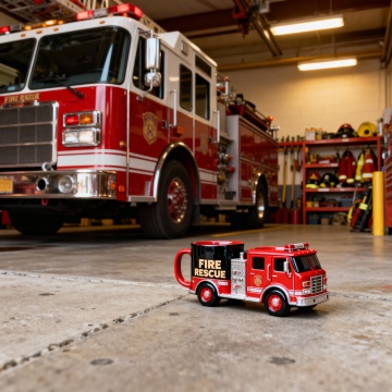 生成一张天将黑在外国消防站停放消防车的门口消防车闪着警灯准备出发