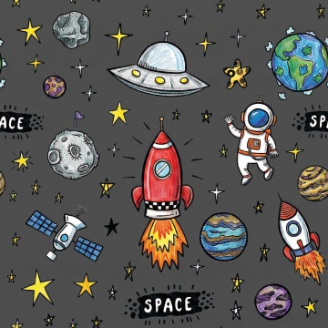一套9个卡通风格太空主题元素的系列素材集合,采用规整的3x3网格排布在纯橙色背景上,每个元素都有清晰的白色描边和轻微的阴影效果以增强立体感。元素包括:粉色带环行星、红色尖头火箭、蓝色漩涡星球、深蓝色UFO、橙色条纹带环行星、浅蓝色圆顶UFO、蓝白双窗火箭、蓝顶黄底飞碟、橙尾白身火箭,所有元素保持统一的圆润造型、鲜亮高饱和色彩和简洁明快的设计风格,整体视觉层级清晰,信息传达高效,适合作为儿童教育或科幻主题的装饰素材。
