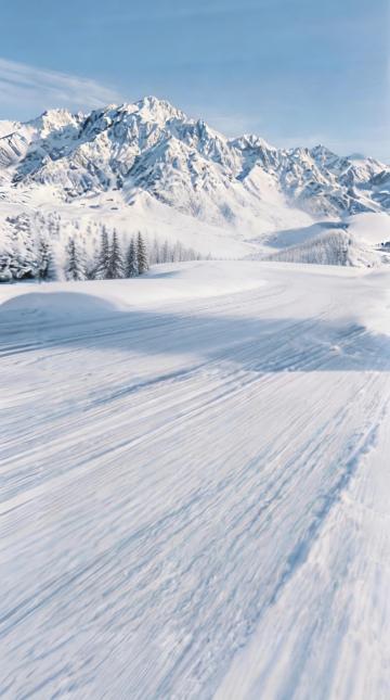 写实主义摄影风格的雪山全景,湛蓝纯净的天空中点缀着几缕形态各异的絮状白云,画面中央矗立着巍峨的雪峰,山顶覆盖着厚实的积雪,山脊线锐利清晰,阳光照射下的雪面呈现出明亮的高光与柔和的阴影过渡,山体下部为深褐色岩石,岩石纹理粗糙且层次分明,近处的山峦呈现出暖棕色与深褐色的渐变,山谷间可见部分冰川痕迹,整体光影为清晨或傍晚的侧逆光效果,营造出壮阔、宁静而神圣的氛围,增加几处山间飘动的薄雾,使画面增添一丝朦胧的神秘感。