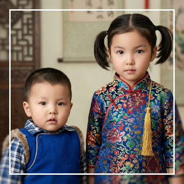 国潮风刺绣童装,融合中式元素与现代设计,红黑配色尽显喜庆感,孩童手持春联,背景古建筑与灯笼烘托浓厚节日氛围。