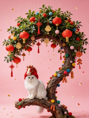 图中宠物穿上红色唐装服饰,带着迷你小马帽子,骑着毛绒红色摇摇马,手里还提着小巧的红灯笼,红色祥云暗纹背景;2026立体字在摇摇马前面,空中飘着细碎的金色彩带,整体跨年喜庆氛围,宠物和摇摇马的比例合理