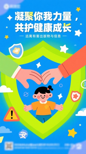 方案 A:针对青少年(《未成年人保护法》) 风格: 手绘插画风,色彩明亮(天蓝色、草绿色)。 构图: 画面中心是一个撑着大伞的卡通形象,伞面写着“法律”。 文案: * 主标题: “法”护成长,童心同行。 内容: 拒绝校园欺凌、网络安全保护、自我保护手册。 视觉符号: 书本、向日葵、法律盾牌。