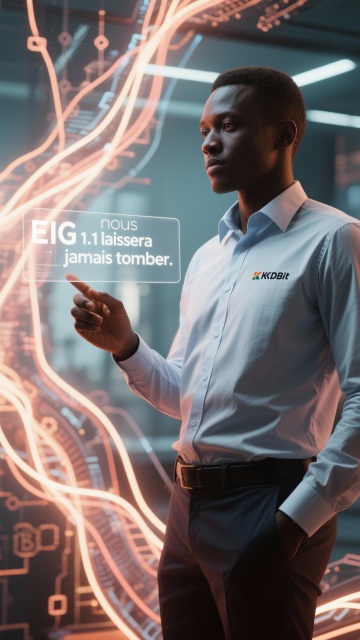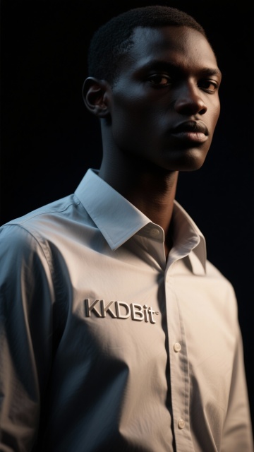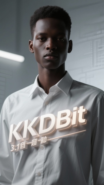 Congolese man or woman standing in a clean, high-tech studio environment. Wearing a modern fitted shirt with raised 3D letters “KKDBit” attached to the chest. Background is minimal with soft floating digital particles and subtle blockchain lines. Soft studio lighting with gentle shadows. Modern fintech brand look, elegant, ultra-realistic, vertical 9:16 composition.
