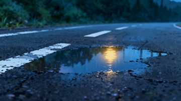 Makoto Shinkai art style, 2D anime, extreme wide shot, burning car wreckage on roadside, flames reflecting on wet road, rain, forest silhouettes, smoke rising, no people, tragic and dramatic, fire glow effect, 16:9 aspect ratio