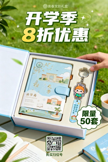 产品信息:校园定制文创礼盒(含笔记本、钥匙扣、书签),促销 信息“开学季8折优惠”“限量50套”,目标受众为在校大学生。 生成1张促销海报,风格青春活力,包 含产品实物元素、促销文案、购买二维码占位符。