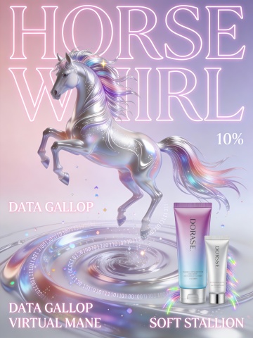 未来感与梦幻交织,金属风骏马跃于数据漩涡之上,霓虹灯风文字与液态风背景营造科技唯美氛围,3D插画风呈现虚拟现实中的时尚潮流之美。