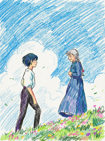 广阔的蓝天占据画面大部分区域,下方是连绵的青草地,几朵白云点缀在蓝天上,整体画面简洁清爽,水彩画风格,色彩明快柔和,可作为背景使用。