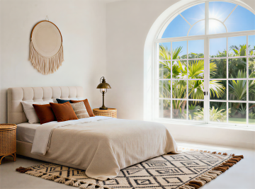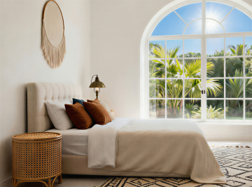 俯视角构图,极简主义风格客厅,整体以冷灰色、深靛蓝和哑光黑为主色调,营造出冷静克制的未来感氛围。傍晚时分,右侧墙面的悬浮式几何窗格精准切割着渐暗的天光,在深灰色微水泥地面投射出规则的菱形阴影图案。房间中央是一个模块化的深靛蓝色布艺转角沙发,表面呈现细腻的纹理褶皱,沙发上随意摆放着两个同色系但不同材质的靠垫——一个光滑如丝,一个粗粝似麻。沙发前是一块超大尺寸的浅灰色羊毛地毯,边缘故意做旧处理,地毯中央悬浮着一个由哑光黑金属框架支撑的透明亚克力茶几,茶几上放置着一个极简线条的黑色陶瓷花瓶,里面插着三支干枯的黑色芦苇。沙发左侧墙角矗立着一盆形态遒劲的琴叶榕,深绿色叶片在冷光下呈现出近乎黑色的剪影,种植在一个带有细微凹痕的手工浇筑混凝土花盆中。沙发背景墙采用了深浅不一的灰色渐变处理,中央悬挂着一幅无框的几何抽象画,画面由精确的黑色直线和大小不一的白色方块构成,画作下方是一个悬浮式的黑色橡木电视柜,表面只放置了一个造型极简的白色音响。天花板采用无主灯设计,而是在不同区域嵌入了可调节角度的线性LED灯带,光线均匀地漫射在整个空间,强调出墙面的微妙肌理和家具的利落线条。地面采用600×600mm的深灰色哑光瓷砖,以30度角错位拼接,缝隙间填充同色系美缝剂,形成整体感极强的视觉平面。整个空间布局遵循"少即是多"的原则,每一件家具都经过精心挑选,线条锐利如刀锋,光影层次分明,呈现出一种冷静而富有力量的空间美学。