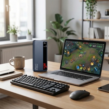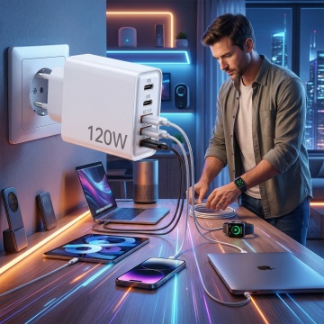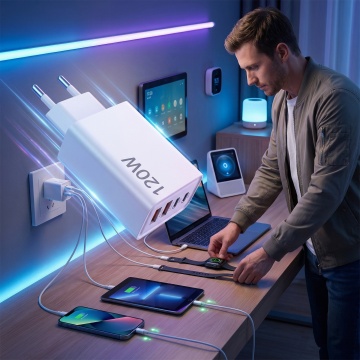 赛博朋克风格的智能手机充电场景,霓虹蓝与紫色渐变光效笼罩,手机屏幕显示动态赛博数据流图案,充电器和数据线呈现金属质感与霓虹灯带装饰,白色桌面转化为带有电路纹理的黑色高科技平台,背景墙变为布满全息投影广告和管线的未来都市夜景,整体光影对比强烈,充满未来科技感与机械美学,高细节,8K渲染,电影级构图