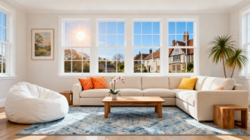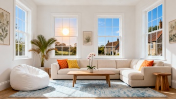 现代简约风格室内场景,不同角度和布置的大窗户,窗外是蓝天白云下的城市与绿色树林景观,窗台上摆放着绿植盆栽、透明玻璃杯和书籍,室内有白色懒人沙发、浅色地毯和木质小桌,温暖的自然光透过窗户洒入,光影柔和,色调以白色、浅木色和自然绿色为主,整体氛围明亮、宁静、舒适,展现不同窗户设计在空间中的布局与采光效果,突出窗景与室内陈设的和谐统一。