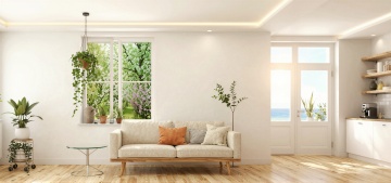 3D渲染风格的现代简约客厅,从不同角度展现的室内场景,柔和明亮的自然光从大窗户洒入,形成温暖的光影效果和清晰的阴影细节,浅色木地板搭配米白色地毯,宽敞的浅灰色L型沙发上摆放着白色和浅蓝色靠垫,沙发前是浅色木质茶几,上面有简约的装饰品,背景墙为纯净的白色,一侧有木质置物架摆放着小型装饰画和绿植,另一侧是大型绿色植物增添生机,整体采用清新淡雅的配色方案,房间内的家具摆设布局经过精心设计,呈现出舒适、整洁、通透的居住氛围,具有高级的空间感和设计感。