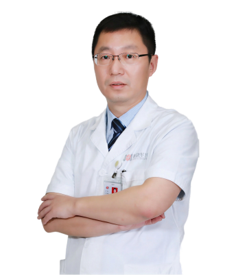 扁平风格卡通医生插画,戴着圆形眼镜,黑色短发,面带微笑,穿着白色医生大褂,内搭蓝色衬衫和领带,脖子上挂着听诊器,双臂交叉在胸前,整体采用简洁明快的线条,色彩鲜明柔和,无背景,形象亲切专业。