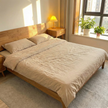 极简主义风格室内场景,柔和的米白色墙壁,自然光透过木质百叶窗和米色垂坠窗帘洒入,浅灰色木地板上铺着带有细腻波浪纹理的浅色地毯。房间中央是一张造型圆润、线条流畅的白色羊羔绒单人沙发,搭配一个橄榄绿色的方形靠垫。沙发旁是一个白色圆柱形边桌,桌面上摆放着一本翻开的书和一个插有细枝绿植的透明玻璃花瓶。沙发后方墙上悬挂着一幅现代抽象画,画作以棕色、米色、白色和橙色的大胆笔触构成,带有明显的颜料肌理感。右侧是嵌入式浅木色置物架,其中一层放置着一个透明玻璃花瓶,里面插有绿色植物。整体色调温暖柔和,光影层次丰富,营造出宁静、舒适、简约而不失格调的居住氛围,空间布局通透,细节处理精致,具有现代简约的高级设计感。